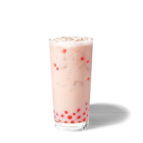 Frappuccino® mit Milch und Erdbeer Sauce, geblendet mit Eiswürfeln und gekrönt mit Sahne.